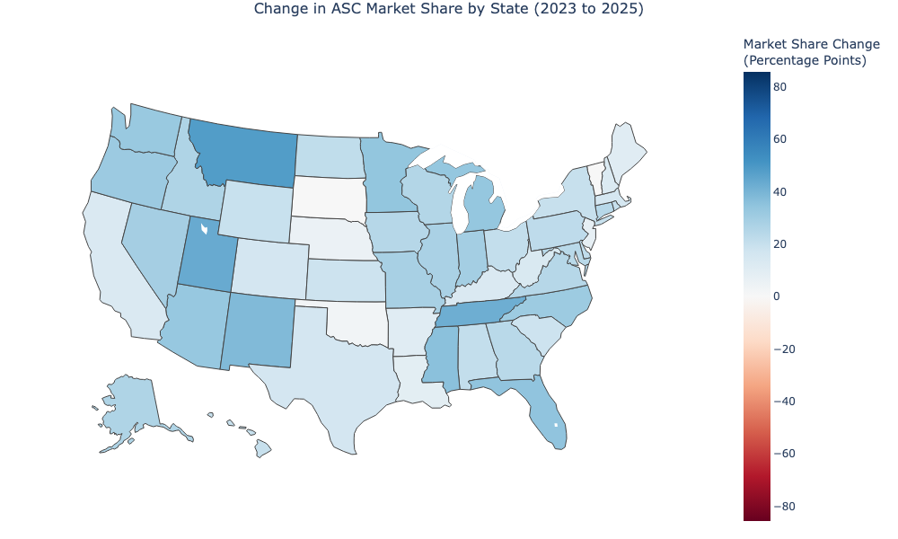 In terms of market share growth, Utah and Tennessee went from single-digit ASC market share to majority ASC, a fundamental rewiring of where care happens in those states. Montana led the way with a 48-point increase.